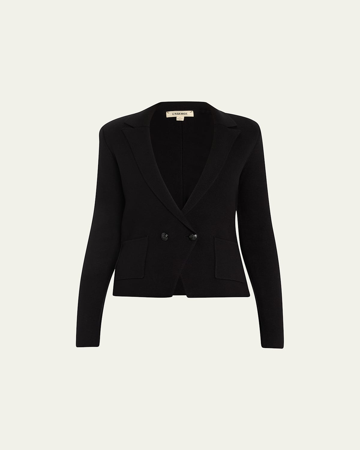L'Agence "Sofia" texturedknit doublebreasted blazer Notched lapels Long sleeves Patch pockets Slim fit Cutaway hem Single button closure Cotton/acrylic/nylon Dry clean Imported