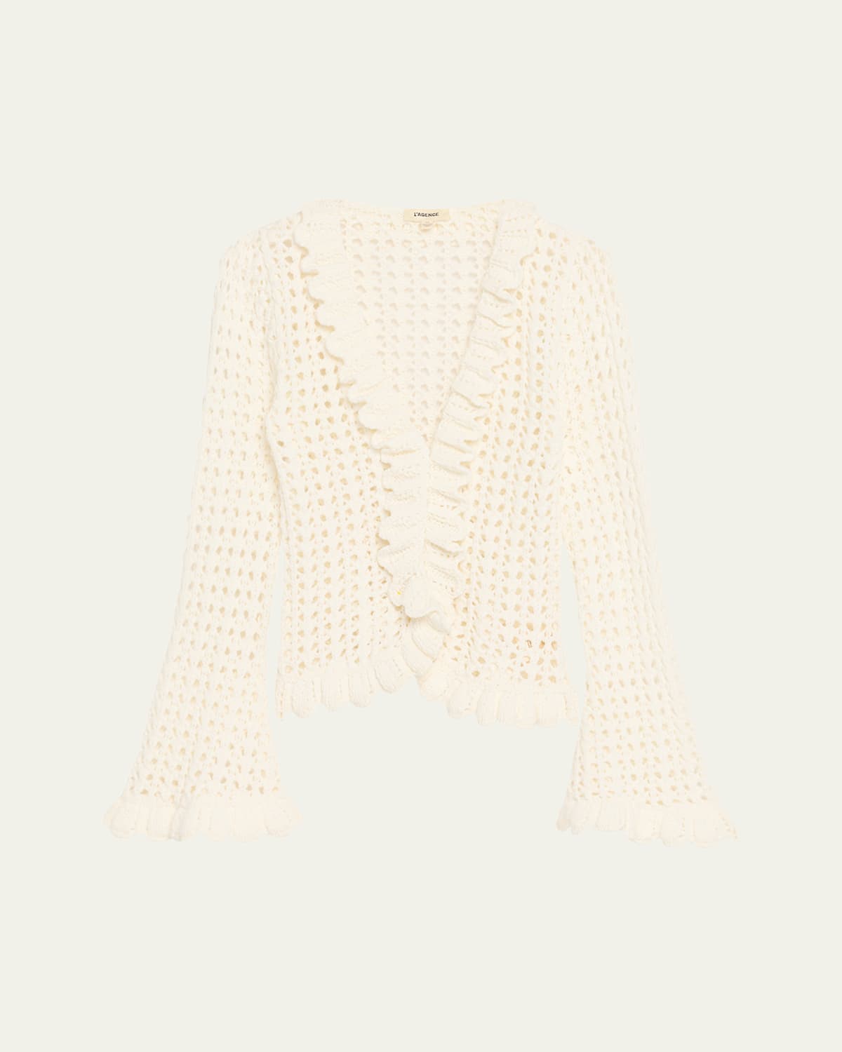 L'Agence "Solaris" cardigan in an openknit construction with ruffle trim V neckline Long sleeves Hip length Slim fit Cotton/nylon/polyamide Imported