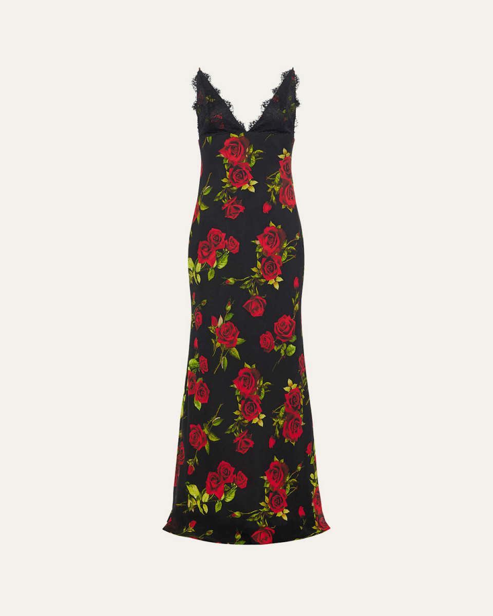 L'Agence "Susanna" roseprinted slip dress accented with a lacetrimmed bust V neckline Sleeveless Hem falls below the knee Slipover style Silk Imported