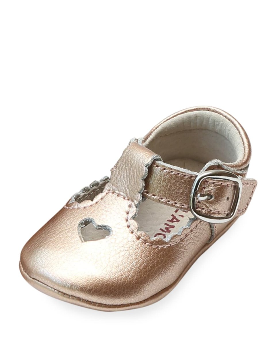 L'Amour Shoes metallic leather Mary Jane crib shoes. Heart cutout at vamp. Scalloped edges. Squared toe. Tstrap with buckle strap. Leather lining. Rubber sole. "Rosale" is imported.