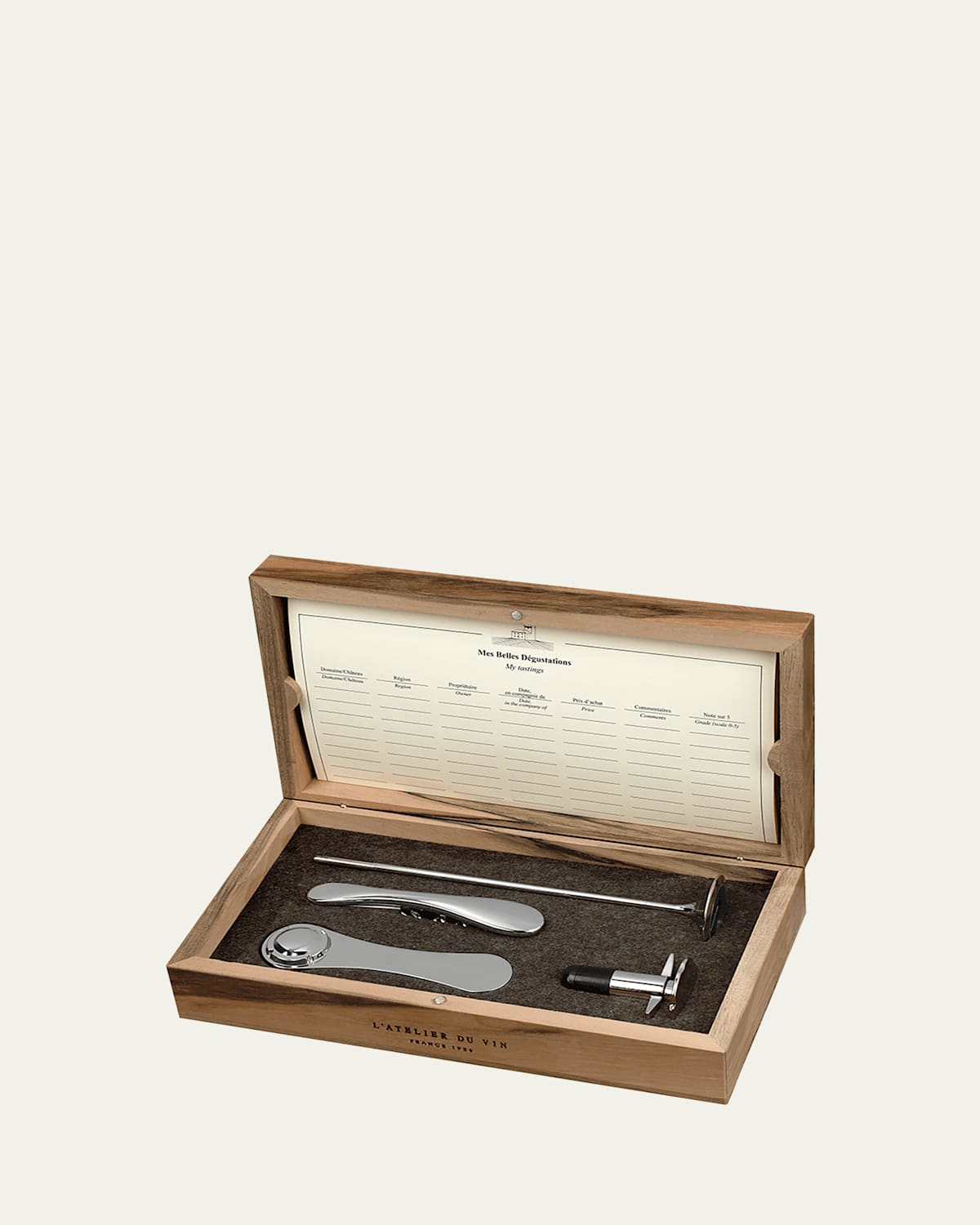 Crafted from solid walnut, the Mini Collector boxes feature a selection of L'Atelier du Vin essentials (items also sold separately). Mastery woodwork, the pieces have been mitrecut assembled and the grains of different woods harmoniously blended. Includes: Chromed metal Garçon®, Cork Opener, Model 54, Printed folio (The Folio will be the memory of your last best wine tastings notes. Thanks to its major French wine regions maps, you'll find your way through the vineyards). Solid walnut and felt. Approx. 9.8"L x 5.5"W x 2.1"T. Handmade in France.
