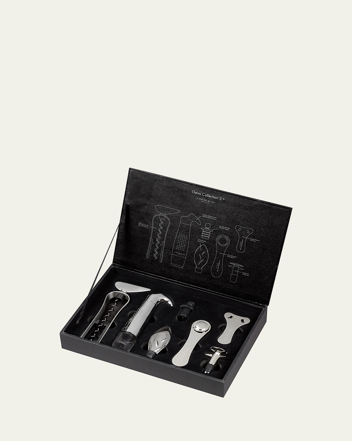 Oneo Collection 2 includes: Chic Monsieur®, ON/OFF Gard'Vin® metal and stopper, Cork Opener, Pourerleaf, Chromed metal Foil Cutter, and Model 54. Stainless steel, chrome plated, and ring in silicone. Approx. 11.8"W x 8"D x 2"T. Imported.
