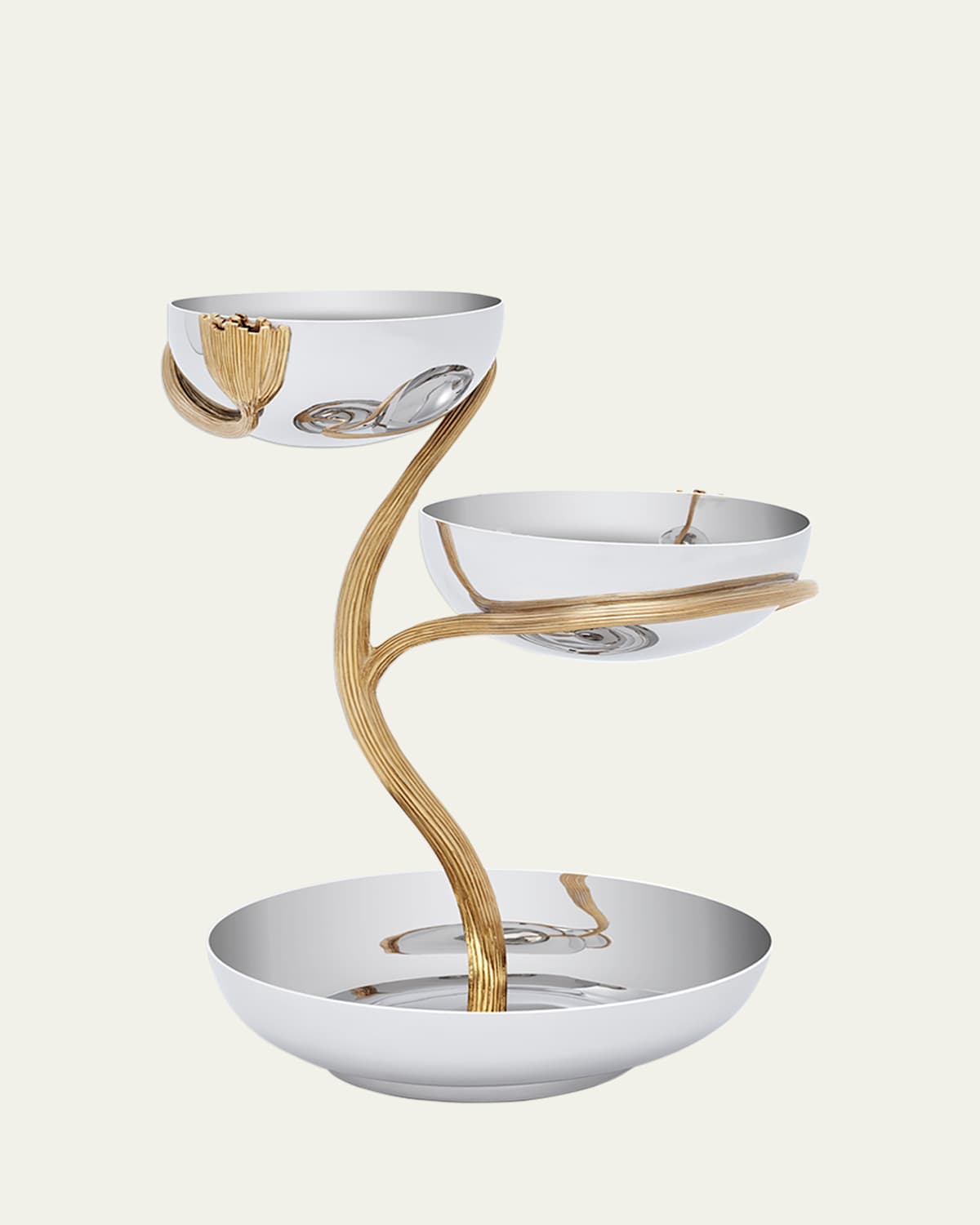 The Deco Leaves Collection recalls the grand serving traditions of the early 20th century. The tiered server includes three tiers to delight guests with a variety of foods. Crafted of handforged stainless steel with 24karat goldplated accents Approx. 7"L x 8 "W x 11"T Item Weight (Lbs.): 2.9 Hand wash Imported