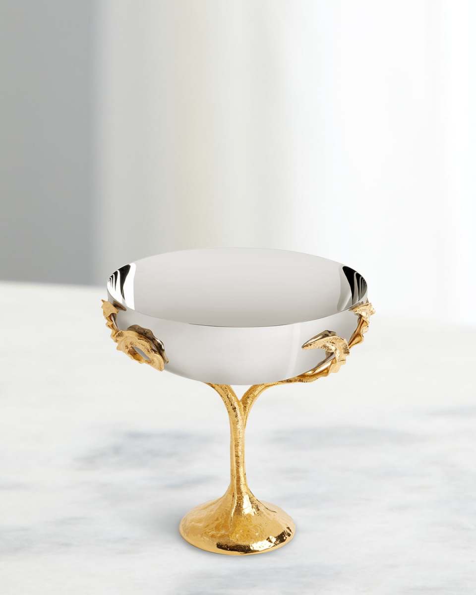 Meticulously crafted from stainless steel and adorned with 24K goldplated accents, the Fern Bowl on Stand features a dynamic handsculpted fern motif showcasing the unparalleled talent of master craftsmen. The Fern Collection merges durability with opulent sophistication, transforming any dining experience into a celebration of refined luxury. Crafted of handforged stainless steel and 24karat goldplated metal Approx. 8"Dia x 8"T Capacity, 27 oz. Item Weight (Lbs.): 2.2 Hand wash Imported