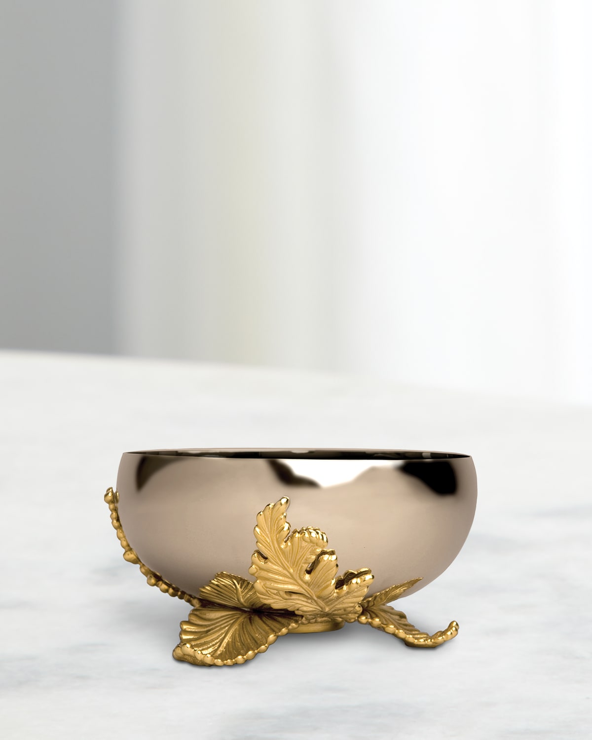 Whimsical and sophisticated, the 6" diameter Lamina serving bowl combines metalwork reminiscent of french filigree, dramatically offset against contemporary stainless steel, adorned with a handcrafted acanthus leaf motif, and sumptuously finished in 24K gold. Crafted of handforged stainless steel and 24karat goldplated metal Approx. 6" Dia. Item Weight (Lbs.): 1.3 Wipe clean Imported
