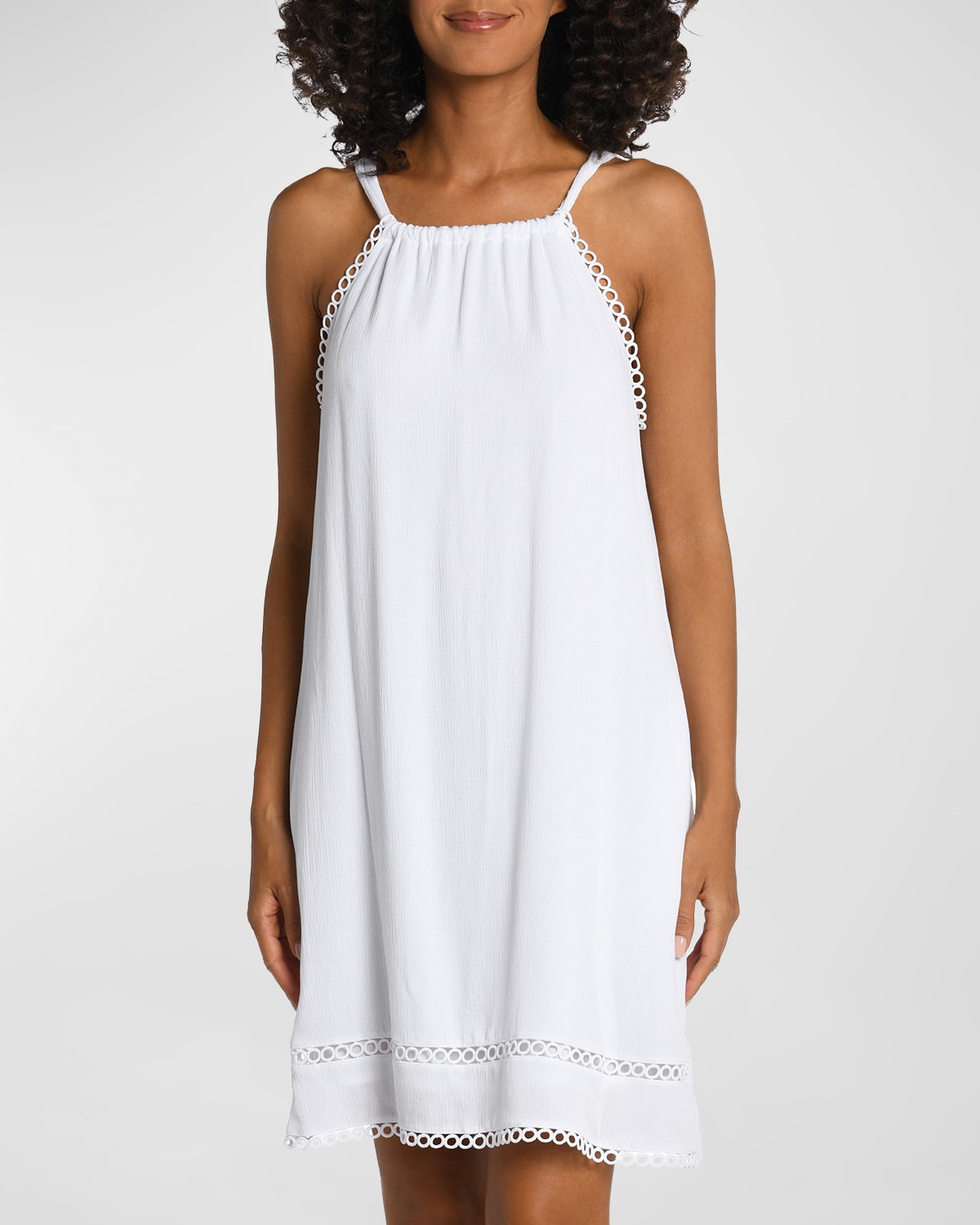 La Blanca "Illusion" dress features round crochet trim detailing High neckline; selfties behind the neck Sleeveless Side seam pockets Hem falls above the knee Aline silhouette Slipover style Rayon Fully lined Hand wash Imported