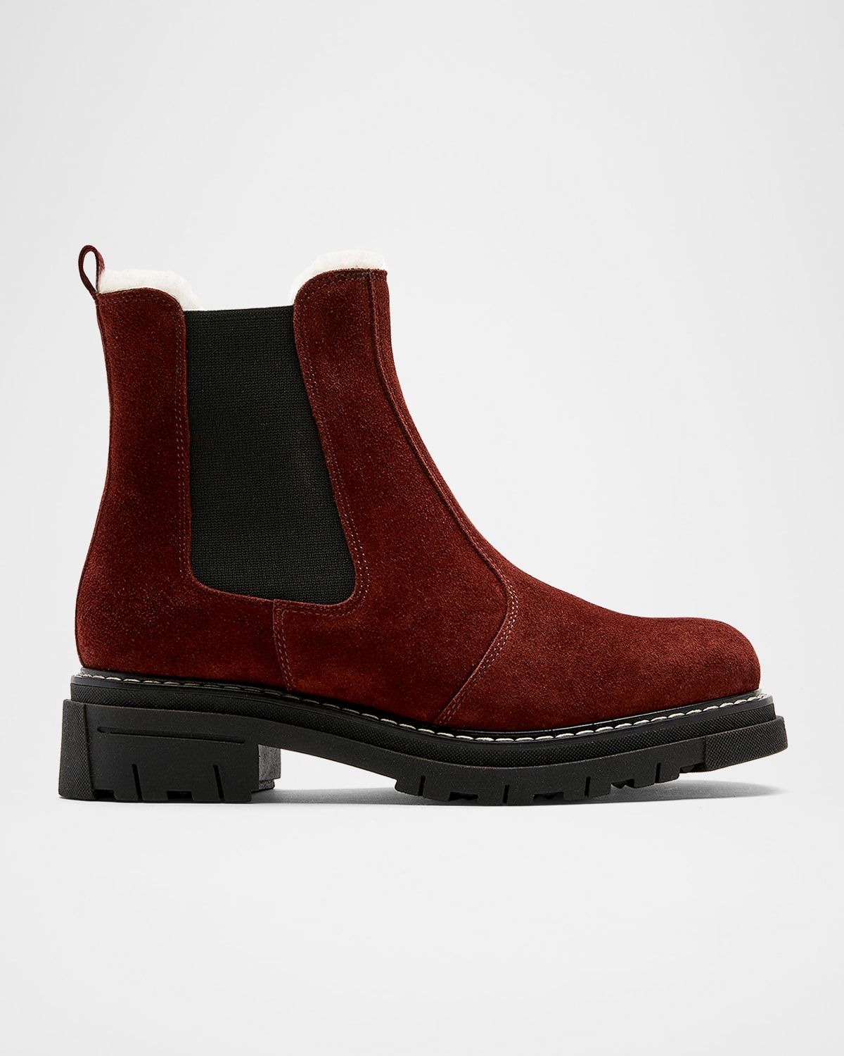 La Canadienne "Derrick" suede chelsea booties with dyed sheep shearling (Italy) lining and a chunky lug sole 1.50 in / 40 mm no heel or flat heel; 1.00 in / 25 mm platform Round toe Boot shaft, approx. 5.5"H Elastic side inserts Pulltab at backstay TPR outsole Lining: Shearling Wipe clean Made in Italy