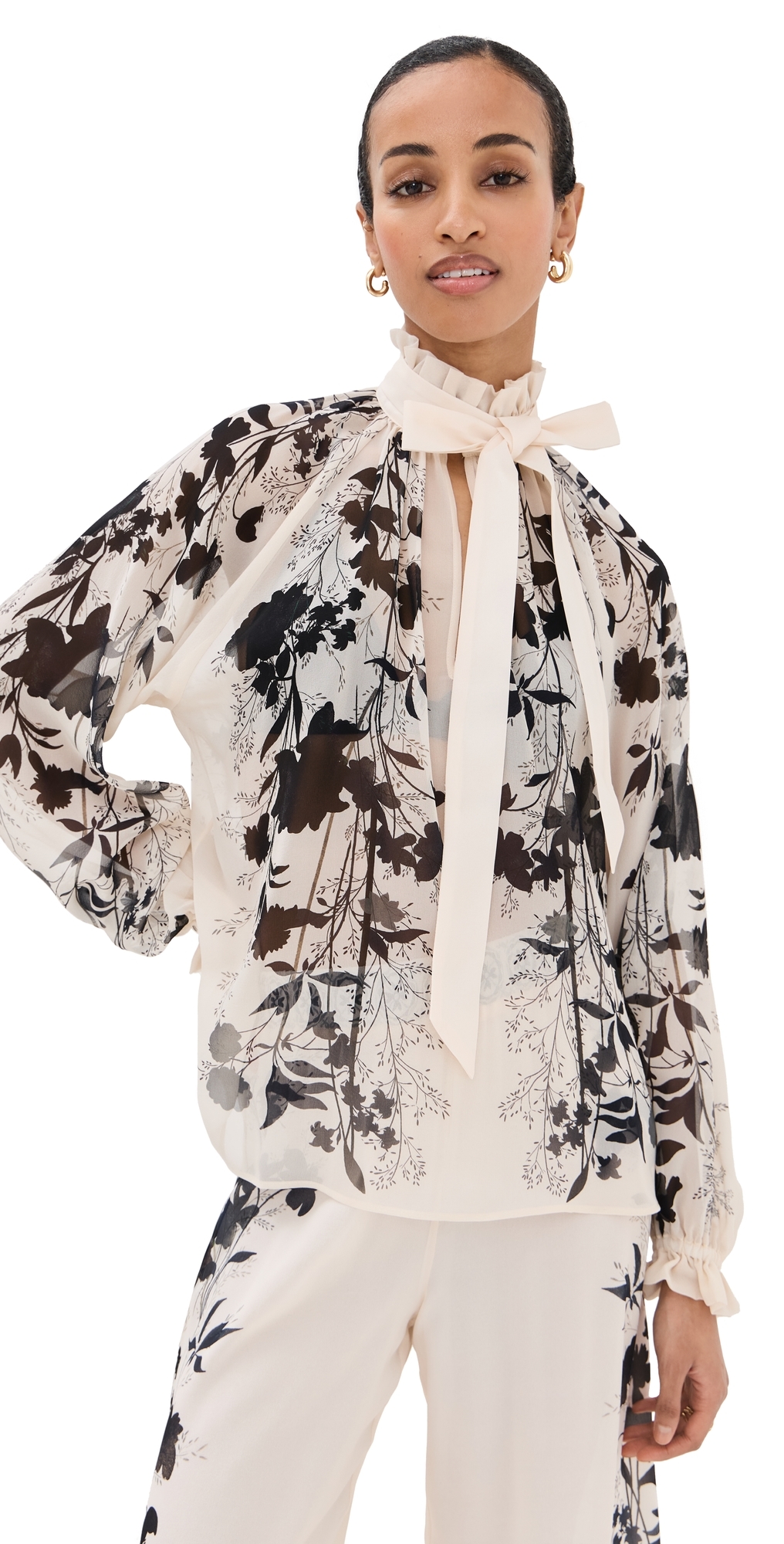 Cannot be shipped outside the USA Fabric: Lightweight, non-stretch silk chiffon. Ruffled collar with optional self-tie closure. Floral print. V neck. Long puff sleeves with elastic cuffs. Button keyhole at front. Shell: 100% silk. Unlined. Dry clean. Made in Italy. Measurements: Measurements from size S Length: 24.75in / 63.0cm, from shoulder