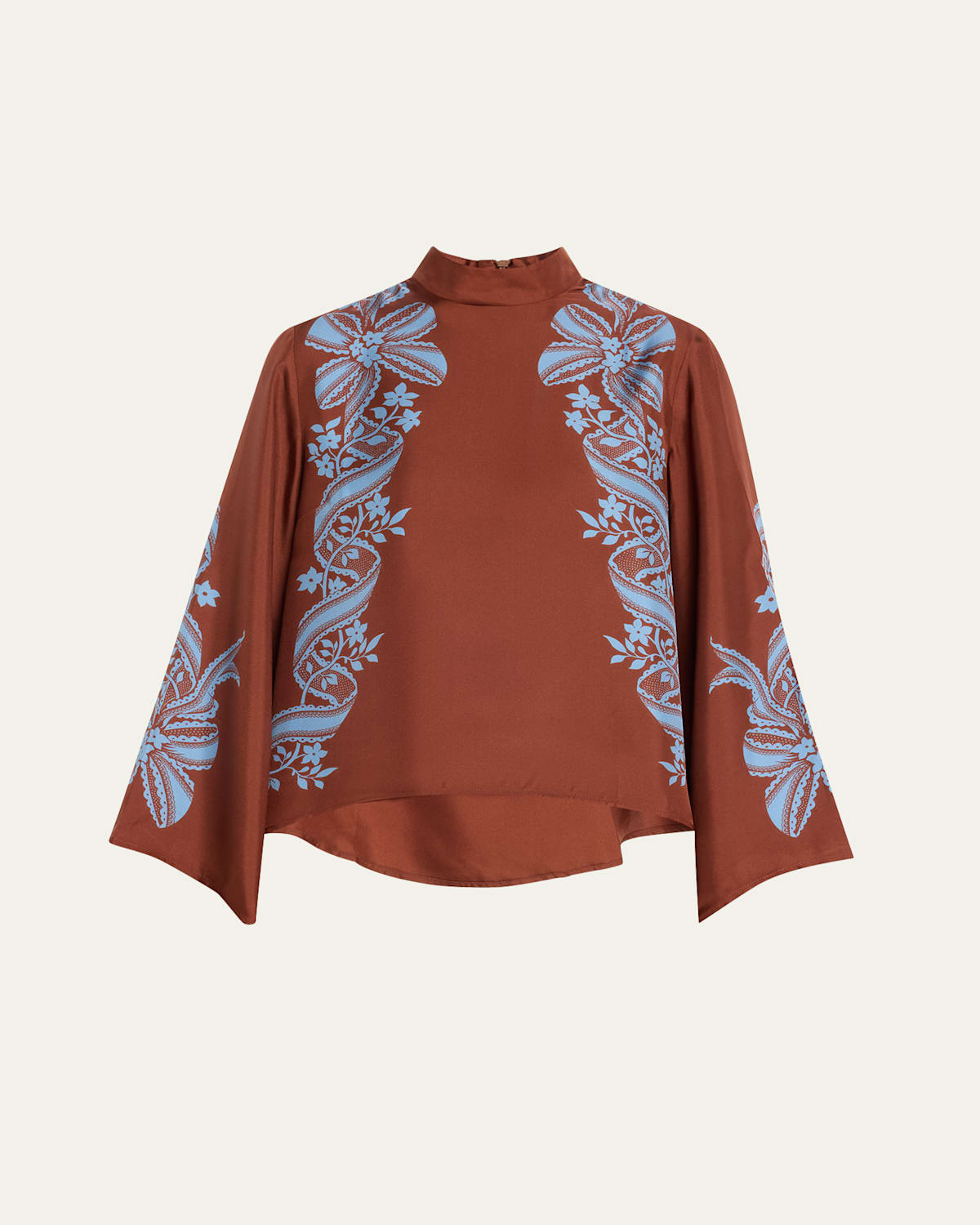 La DoubleJ "Make An Exit" twill top with handplaced print High neckline Long batwing sleeves Aline shape Back zip Silk Dry clean Made in Italy