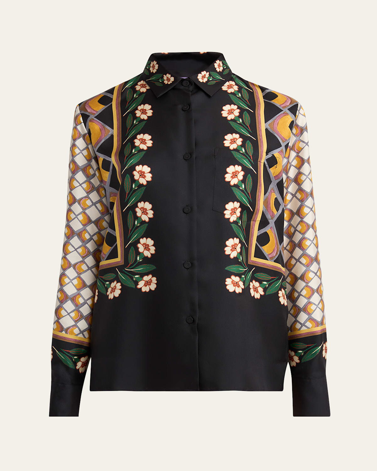 La DoubleJ boy shirt featuring a place foulard print Point collar; button front Long sleeves; button cuffs Loose fit Side slits hem Silk Dry clean Made in Italy