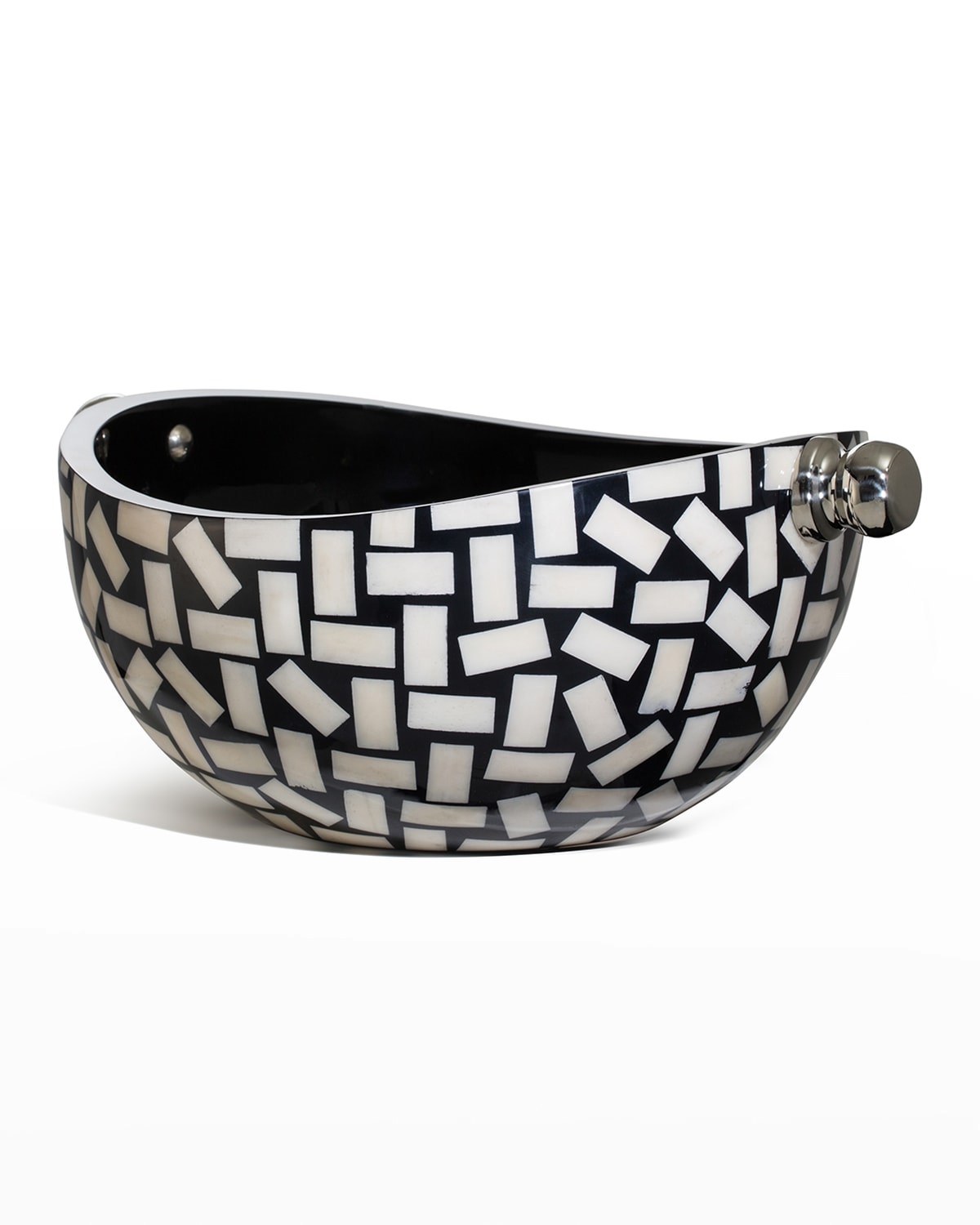 Handcrafted serving bowl made of wood and cow bone from Colombia. Bone tiles are intricately inlayed on a black backdrop to create a unique aesthetic, which is completed with a highgloss lacquer finish. Polished German silver handles. 16.9"W x 12.2"D x 7.5"T. Imported.