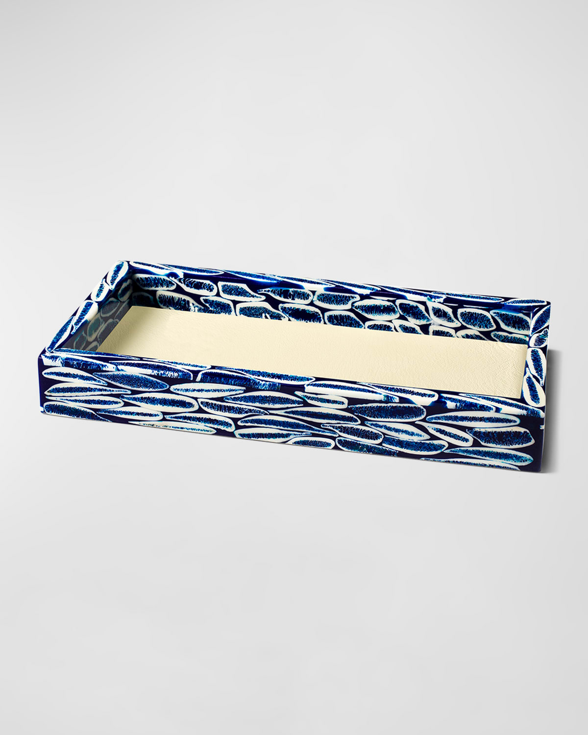 Almondshaped bone is intricately inlaid on an ink blue backdrop to create a unique aesthetic, which is completed with a highgloss lacquer finish. Handcrafted of bone, lacquer, and leather Approx. 12"L x 6W 1.4"T Item Weight (Lbs.): 0.5 Made in Colombia