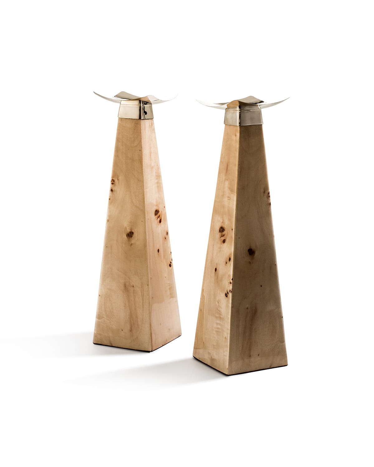 Handcrafted set of two candleholders made of burl veneer and wood. The understated warmth of burl veneer is accentuated by a highgloss lacquer finish. Carefully selected natural materials allow for infinite variations resulting in oneofakind designs. Imported.