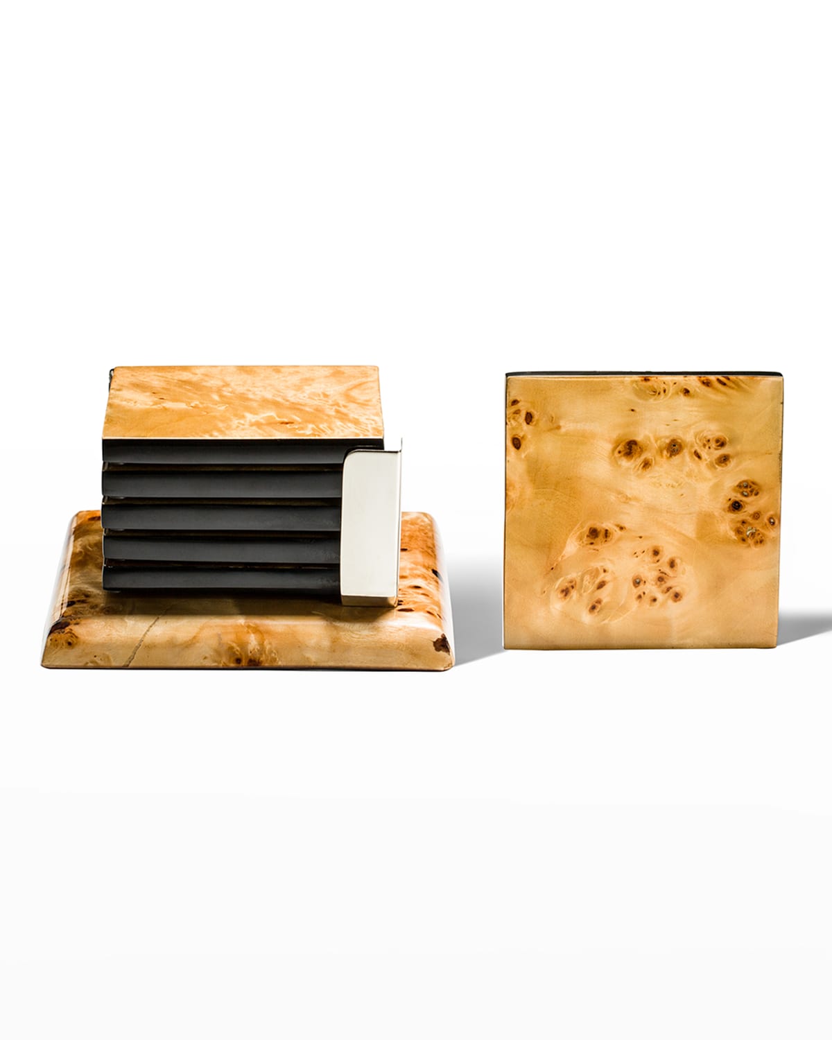 Handcrafted coasters made of wood and burl veneer. The understated warmth of burl veneer is accentuated by a highgloss lacquer finish. Carefully selected natural materials allow for infinite variations resulting in oneofakind designs. Sixpiece set. Imported.