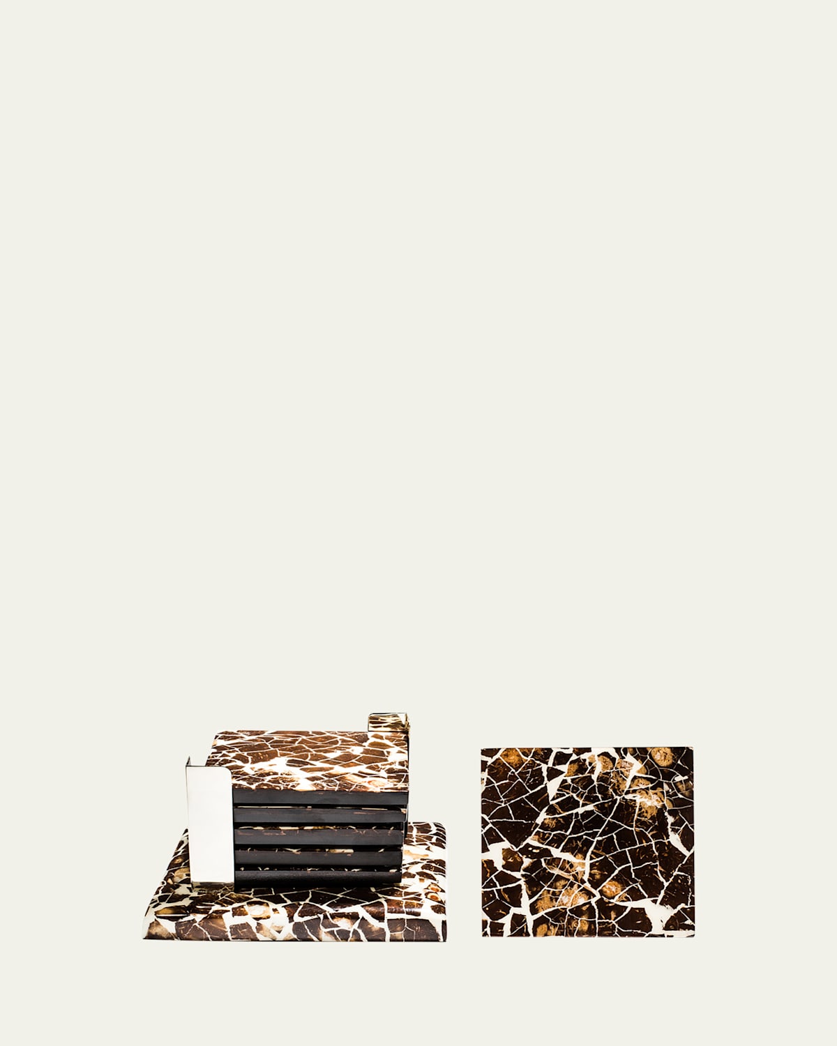 Handcrafted coaster set made of wood and natural coconut shell from Colombia. Sundried coconut shells are inlayed on wood, and finished with highgloss lacquer. Polished German silver holders. Set of six. Holder: 5.9"Sq. x 5.4"T. Imported.
