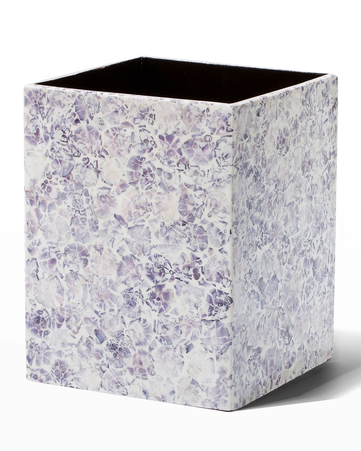 Handcrafted wastebasket made of wood and seashell from Colombia. Varying shades of lavender and blue seashell contrast on a light backdrop, and are complemented by a highgloss lacquer finish. Imported.
