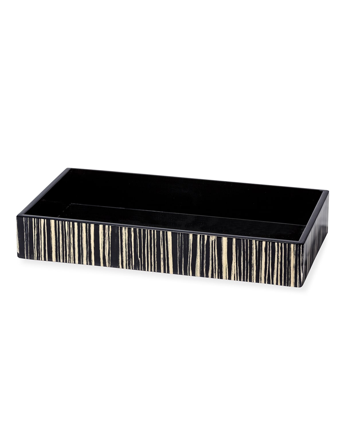 Handcrafted vanity tray in an ink blue finish contrasted by ivory border and further accentuated by a highgloss lacquer finish Made of wood and bone Approx. 11"L x 6.8"W Wipe clean Made in Colombia