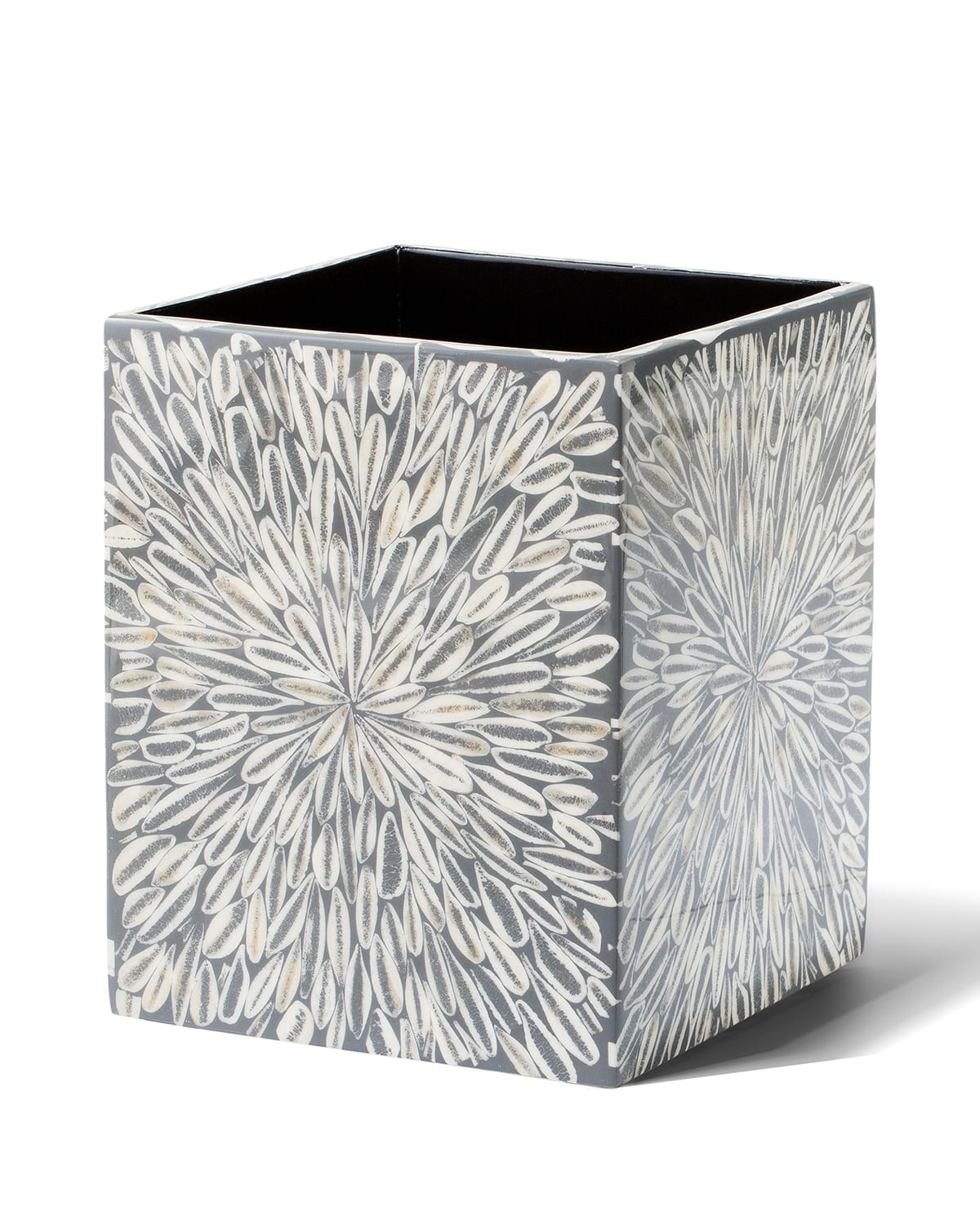 Handcrafted wastebasket made of wood and ethically sourced bull horn from Colombia. The natural beauty of horn veneer, rich in texture and warmth, is highlighted with a highgloss lacquer finish. 8.7''L x 8.7''W x 11''T. Imported.