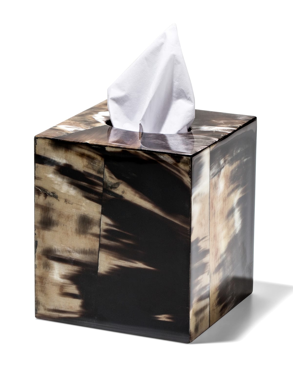 Handcrafted tissue box cover made of wood and ethically sourced bull horn from Colombia. The natural beauty of horn veneer, rich in texture and warmth, is highlighted with a highgloss lacquer finish. 5.9''L x 5.9''W x 6''T. Imported.