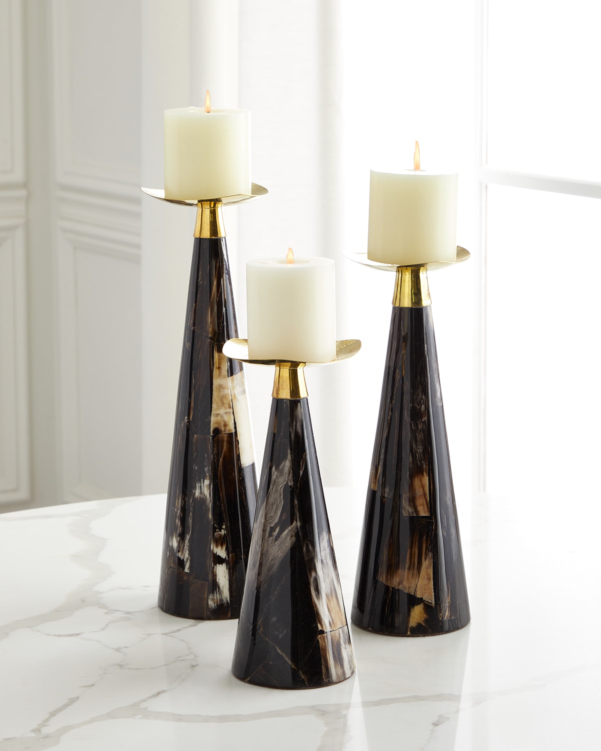Handcrafted set of three candleholders made of wood and ethically sourced bull horn from Colombia The natural beauty of horn veneer, rich in texture and warmth, is highlighted with a highgloss lacquer finish Completed with polished brass candle holders Made of horn and wood Approx. 14.5"L x 12.75"W x 10.5"T Wipe clean Made in Colombia