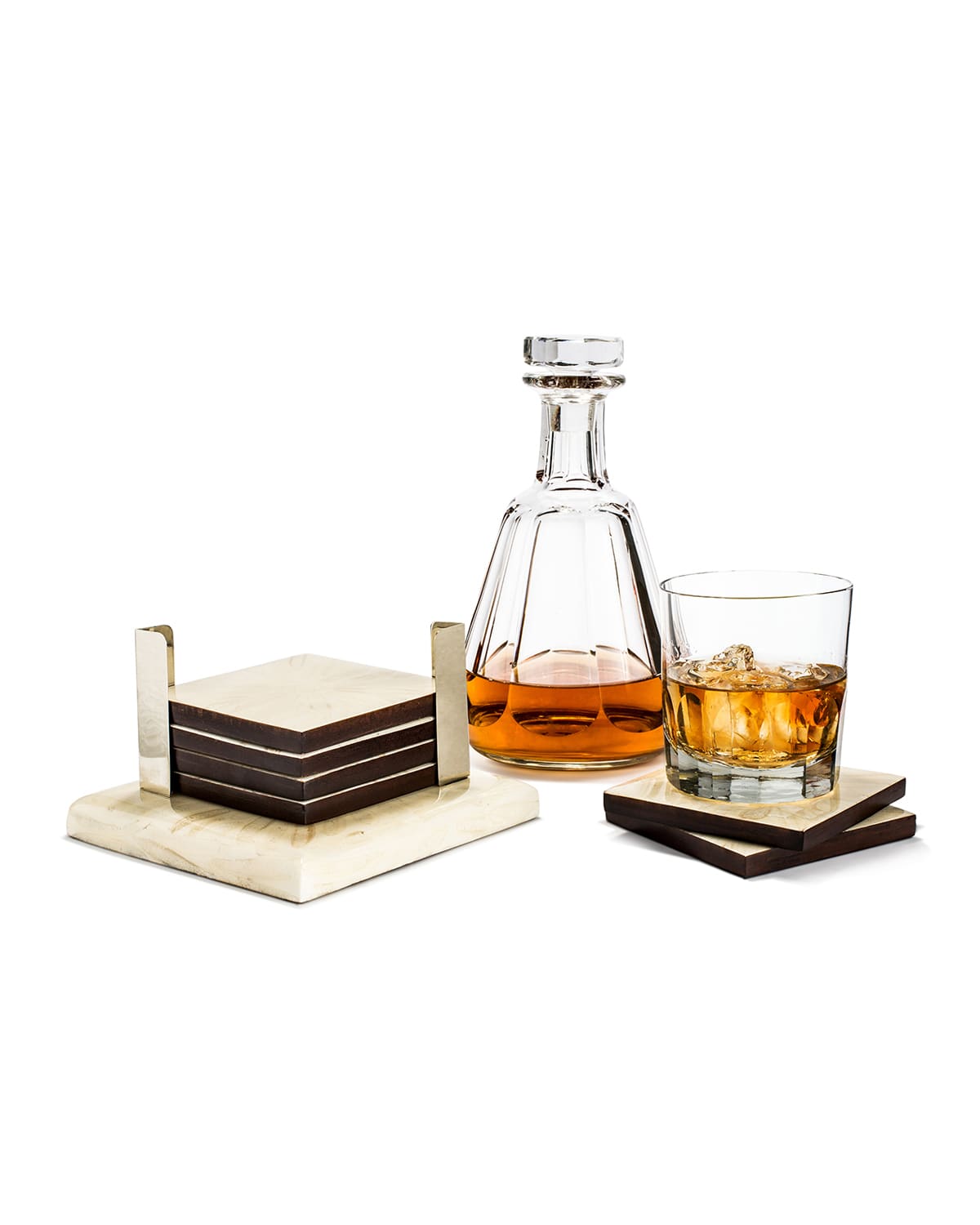 Set of six handcrafted coasters and coordinating holder. Almond shaped Colombian bone is intricately inlaid to create a unique aesthetic. Highgloss lacquer finish. Polished German silver holders. Wood/cow bone/silver. 5.9"W x 5.9"D x 5.4"T. Imported.