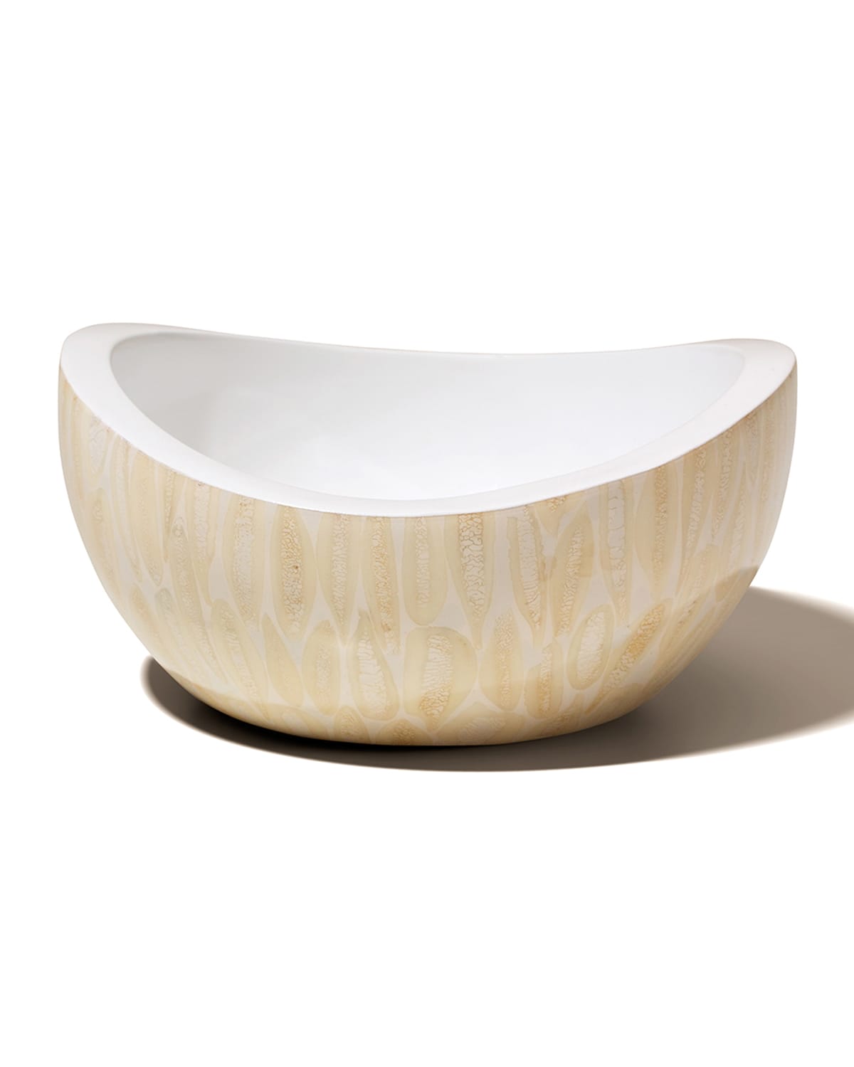Handcrafted accent bowl made of wood and cow bone from Colombia. Almond shaped bone inlay. A highgloss lacquer finish. 6.7"W x 6.7"D x 3.1"T. Imported.