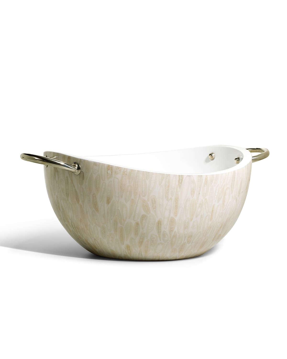 Handcrafted serving bowl. Made of wood and cow bone from Colombia. Polished German silver handles. Boxed weight: approximately 9 lbs. 16.9"W x 12.2"D x 7.5"T. Imported.