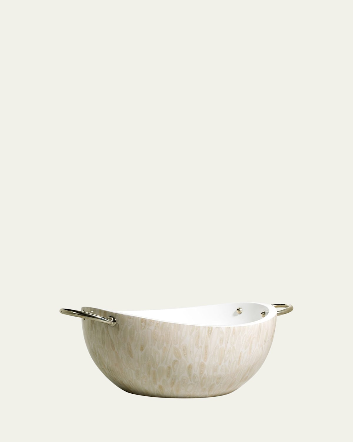 Handcrafted serving bowl. Made of wood and cow bone from Colombia. Polished German silver handles. Boxed weight: approximately 9 lbs. 16.9"W x 12.2"D x 7.5"T. Imported.