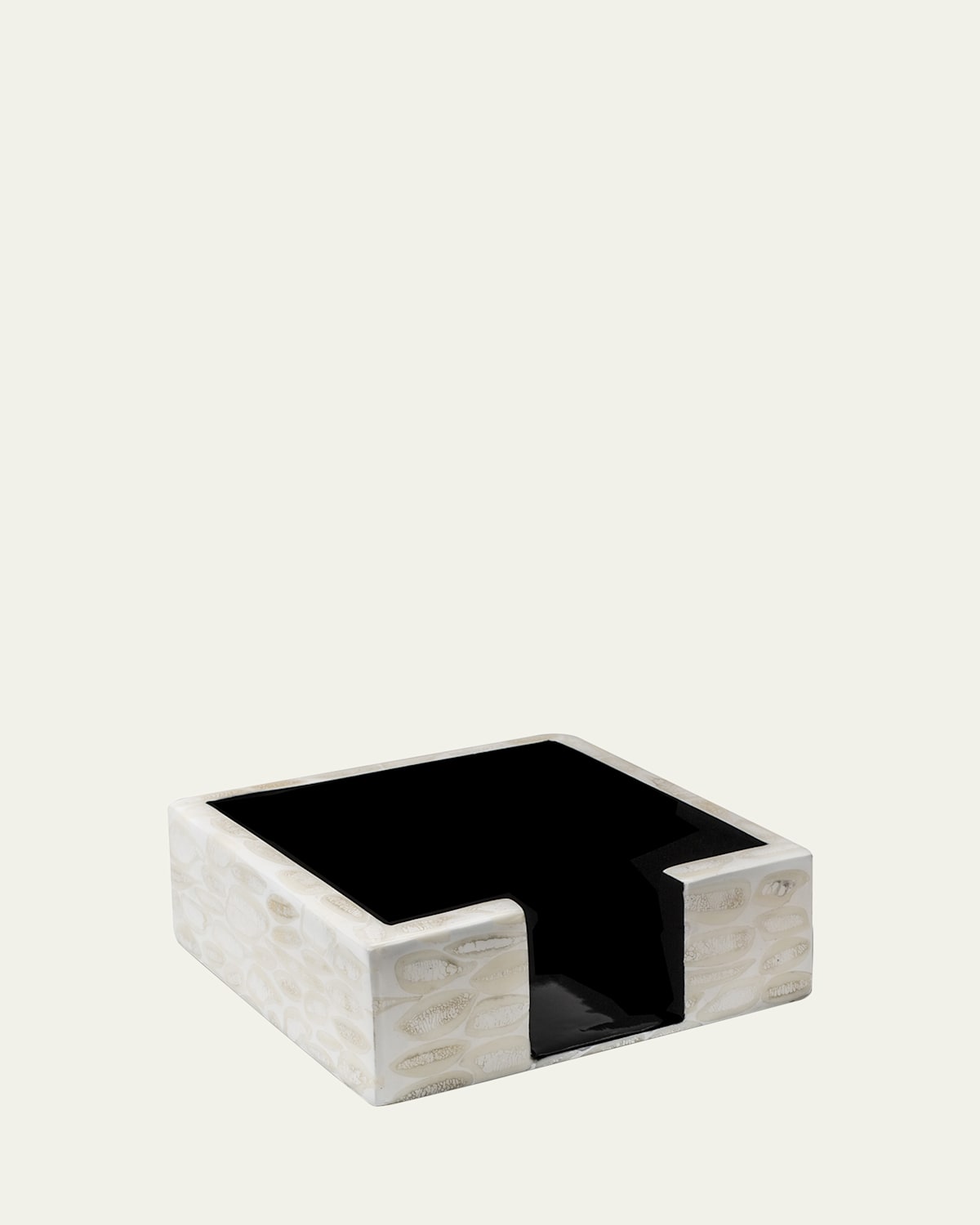 Handcrafted cocktail napkin holder made of wood and cow bone from Colombia. Almondshaped bone is intricately inlayed to create a unique aesthetic, which is completed with a highgloss lacquer finish. 6.5"Sq. x 2.3"T. Imported.