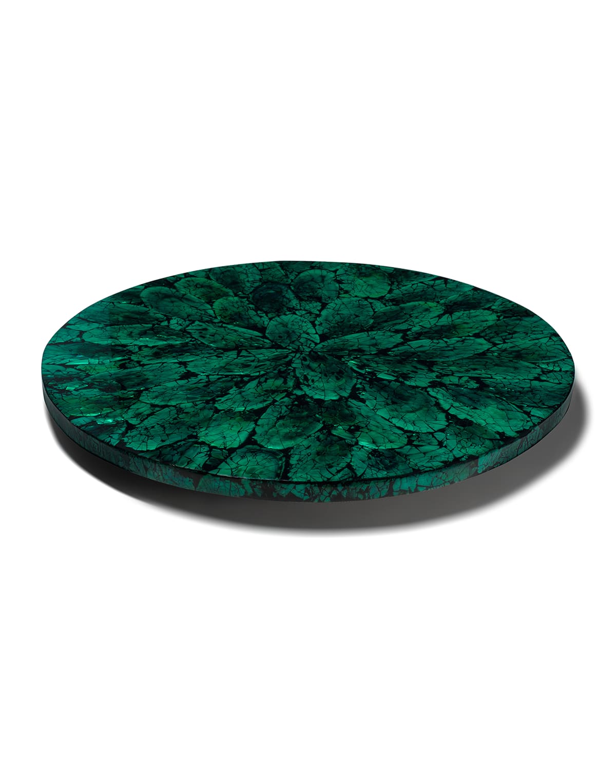 Handcrafted Lazy Susan made of wood and mother of pearl shells from Colombia. The malachite green color is the result of a proprietary dye process, and is accentuated by a highgloss lacquer finish. 15.7"Dia. x 1.5"T. Imported.