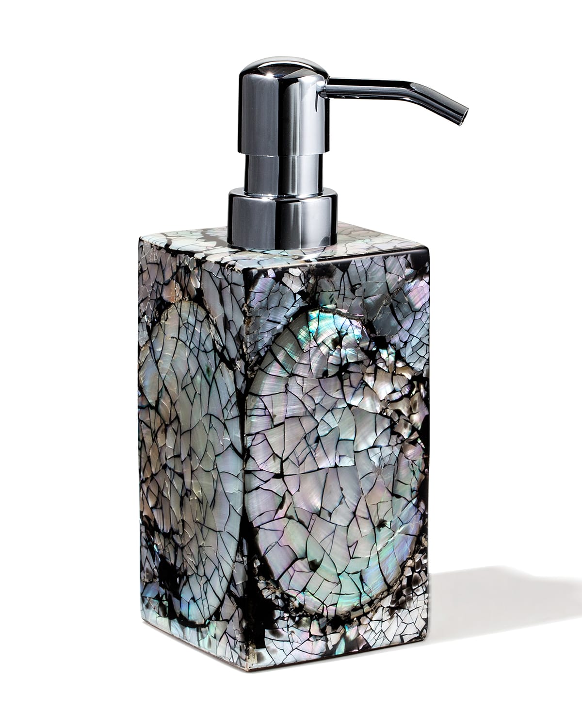 Handcrafted soap dispenser made of wood and motherofpearl shells from Colombia. Highgloss lacquer finish. German silver pump. 2.8"L x 2.8"W x 7.5"T.