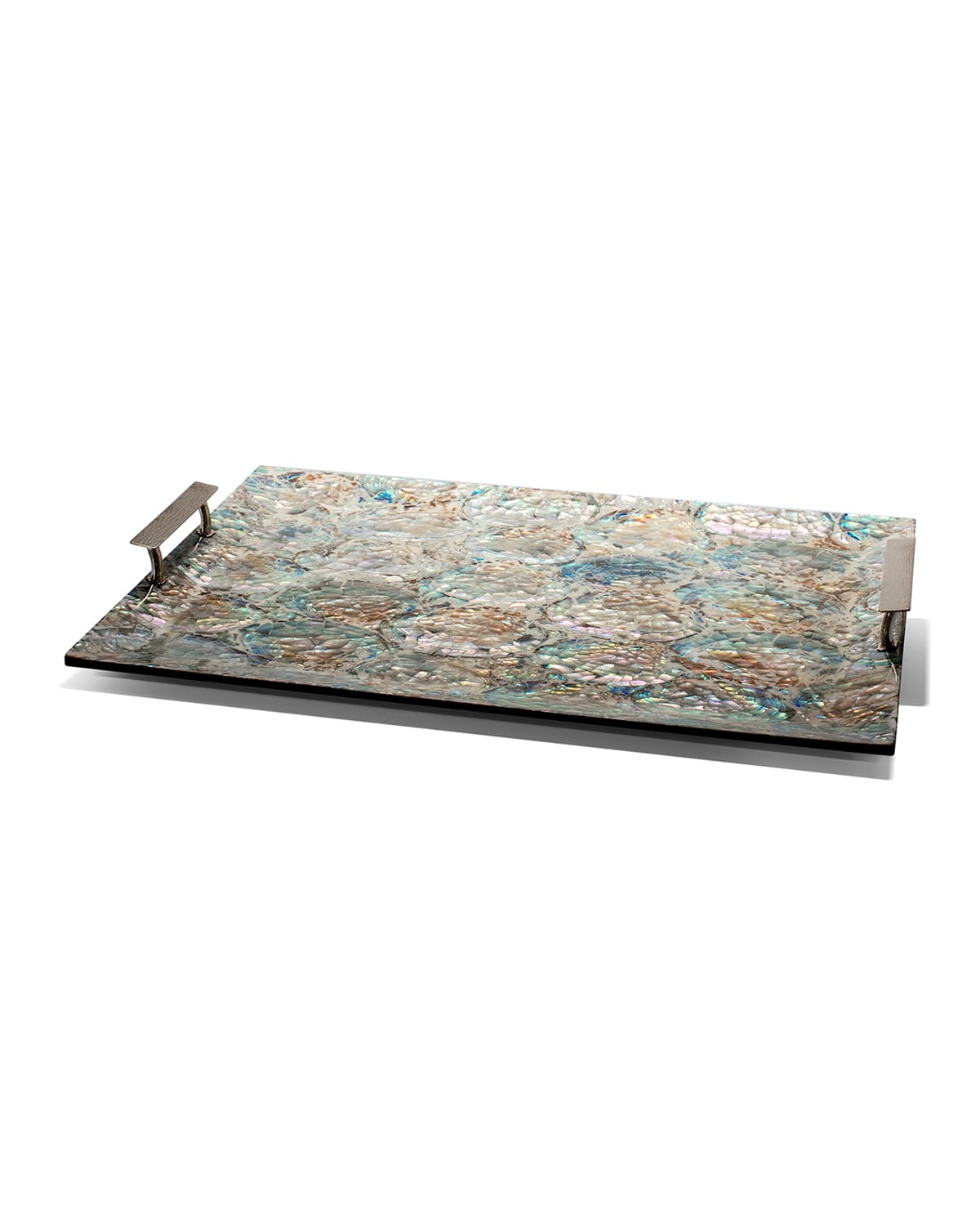 Handcrafted tray made of wood and mother of pearl shells from Colombia. Motherofpearl shells are dyed to a lustrous red color, and finished with a highgloss lacquer. Polished German silver handles. 20.5"W x 14.2"D x 3.3"T. Imported.