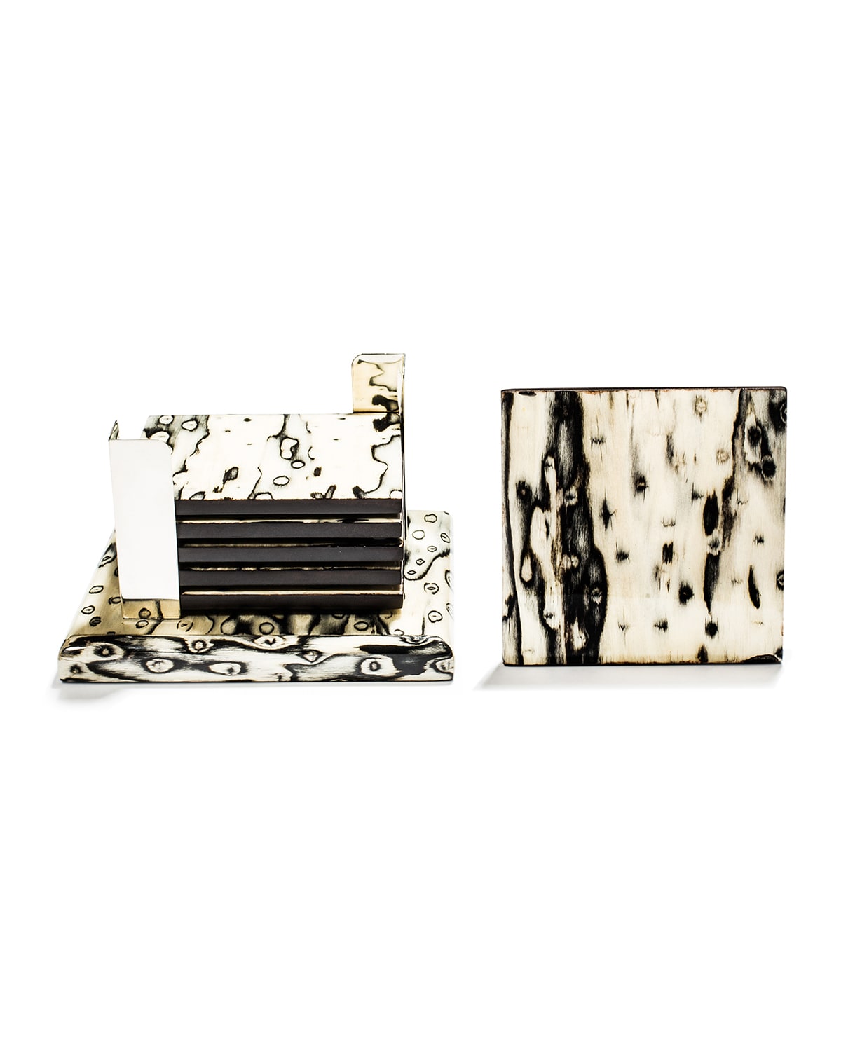 Handcrafted coaster set of 6. Made of wood and ojo de pajaro veneer. Polished German silver holders. 5.9"W x 5.9"D x 5.4"T. Boxed weight: approximately 6 lbs. Imported.