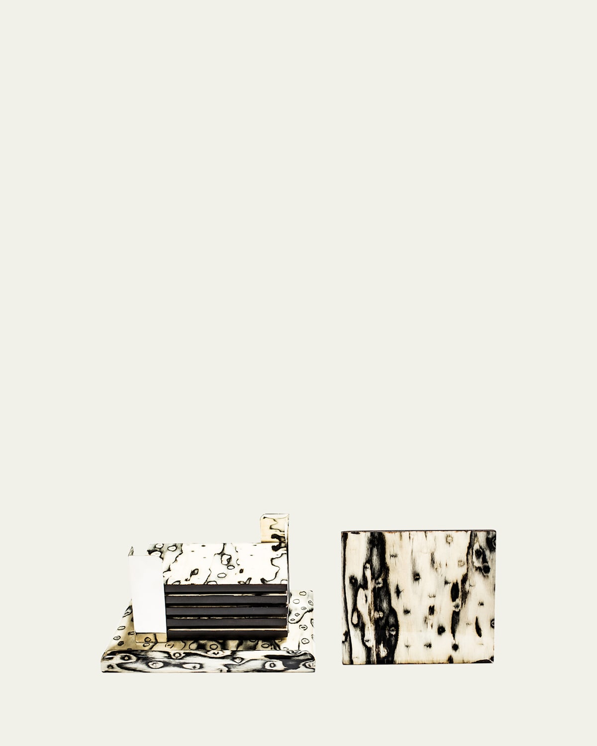 Handcrafted coaster set of 6. Made of wood and ojo de pajaro veneer. Polished German silver holders. 5.9"W x 5.9"D x 5.4"T. Boxed weight: approximately 6 lbs. Imported.