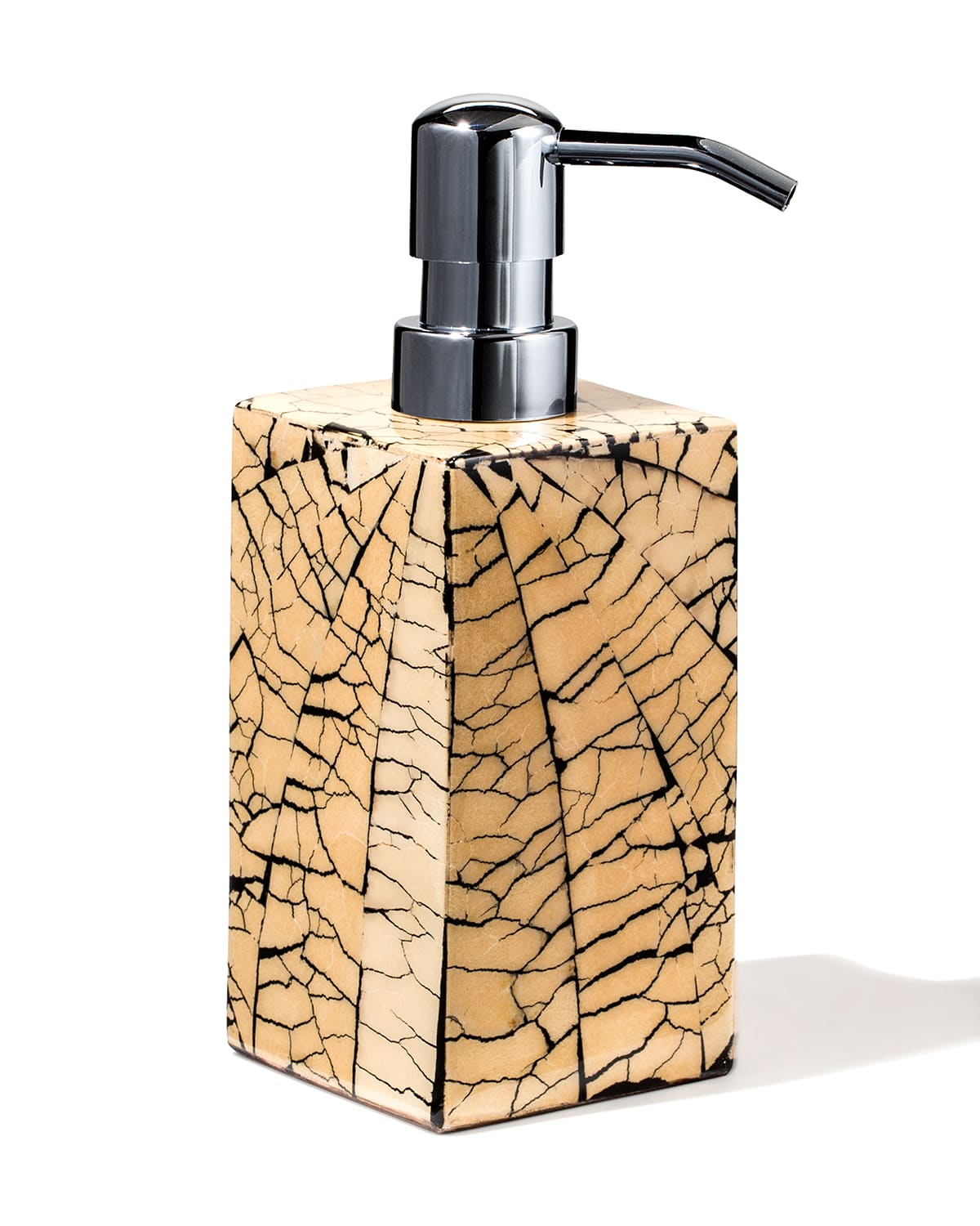 Handcrafted soap dispenser made of wood and dried, inlaid Totumo seeds from Colombia. German silver pump. 2.8"L X 2.8"W X 7.5"T.