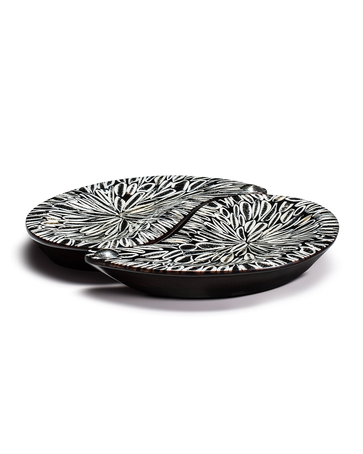 Handcrafted set of two platters made of wood and cow bone. Almond shaped bone is intricately inlayed to create a unique aesthetic, which is completed by a highgloss lacquer finish. Carefully selected natural materials allow for infinite variations resulting in oneofakind designs. Imported.