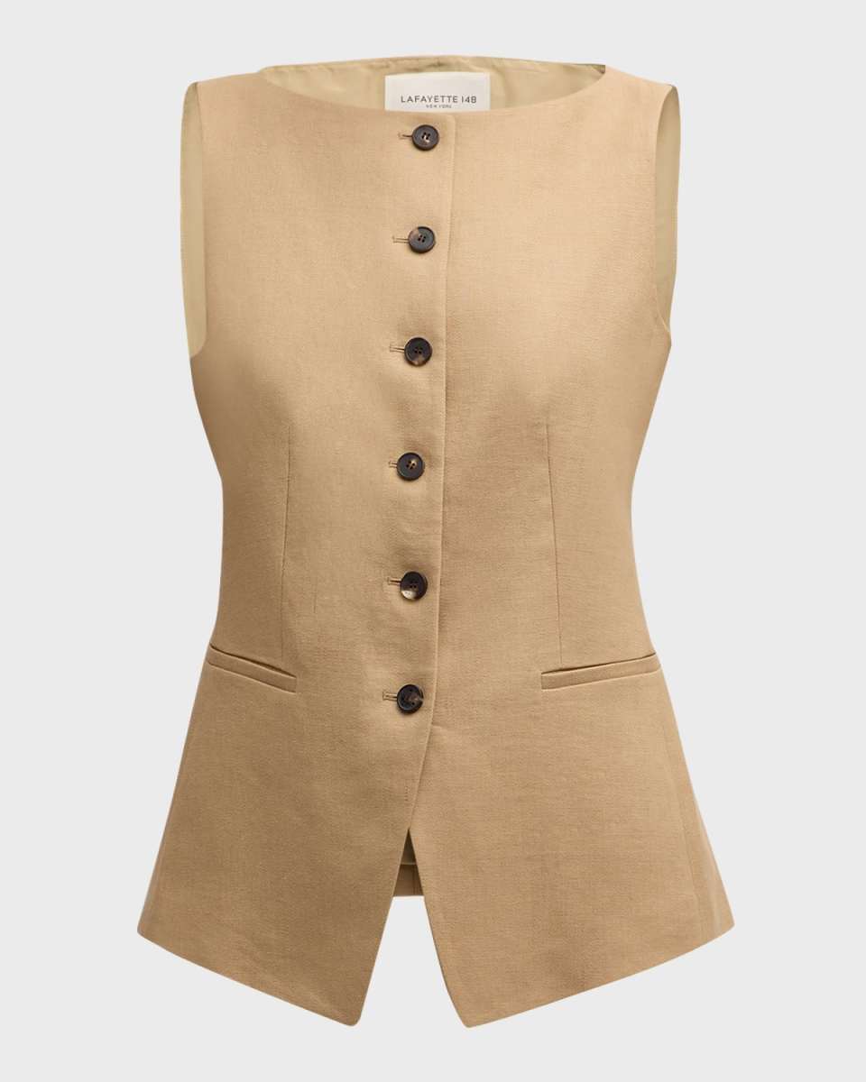Lafayette 148 New York vest in linen with vertical waist darts Approx. 23"L from shoulders to hem Bateau neckline; button front Sleeveless Front welt pockets Relaxed fit Linen Fully lined Dry clean Imported