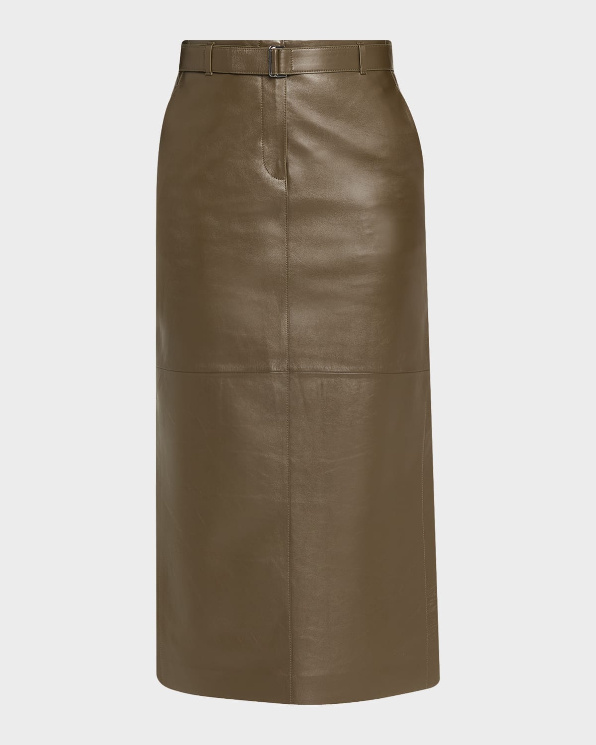 Crafted of leather, this Lafayette 148 New York midi skirt is finished with clean, straight lines and a matching adjustable belt Sits high on the hips Side slant pockets Double slit hem Hem falls below the knee Straight silhouette Zip fly Leather Imported