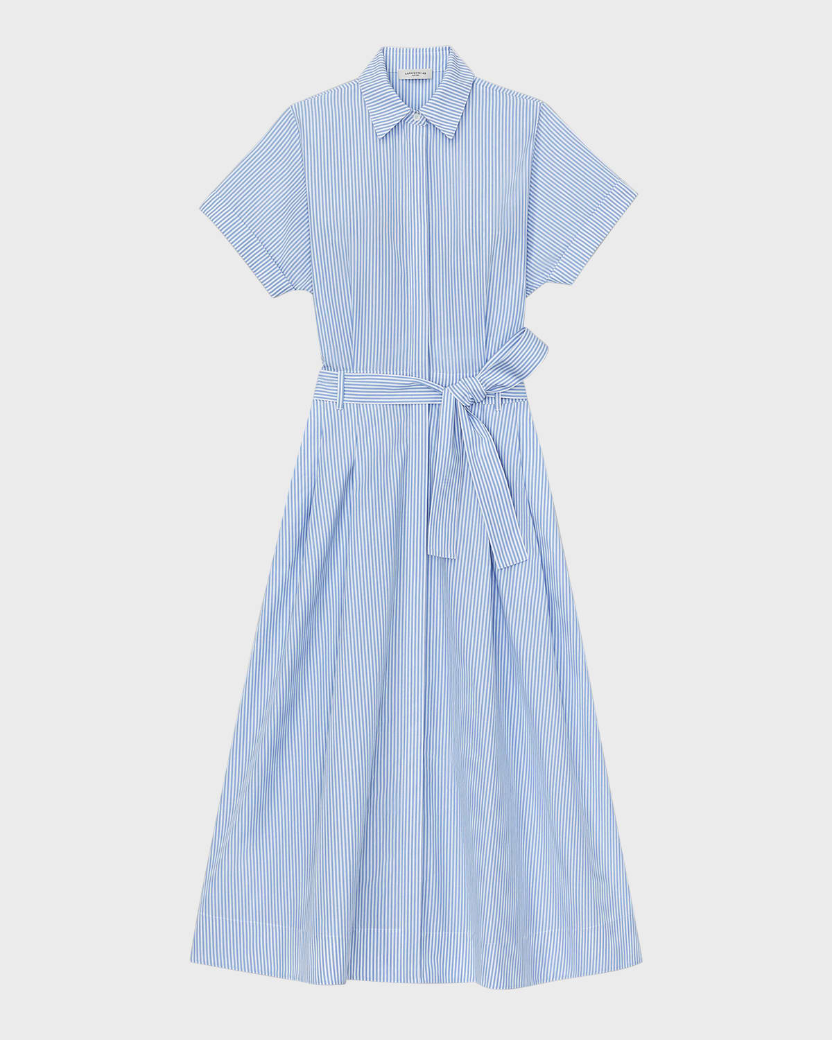 Lafayette 148 New York striped midi shirtdress in cotton Approx. 49.5"L from shoulders to hem Spread collar; concealed button front Short sleeves Waist selftie Onseam pockets Hem falls below the knee Aline silhouette Cotton Machine wash cold Imported