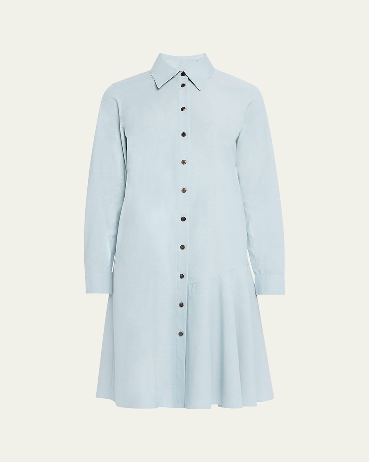 Lafayette 148 New York shirtdress in cotton with flounce hem Approx. 38"L from shoulders to hem Spread collar; button front Long sleeves; button cuffs Hem hits around the knee Aline silhouette Cotton Unlined Dry clean Imported