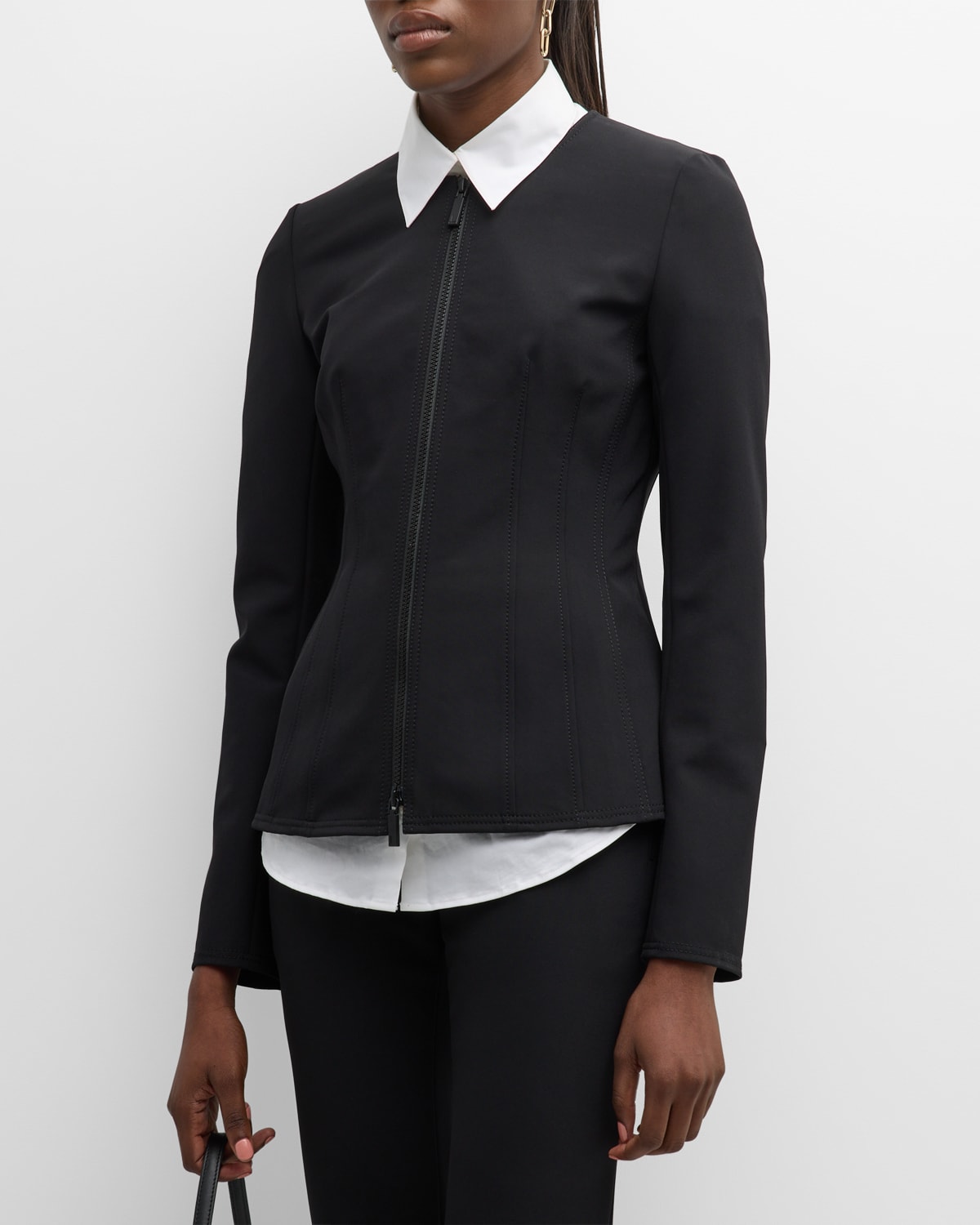 Lafayette 148 New York multiseamed jacket with topstitching Approx. 23.5"L from shoulders to hem Crew neckline; twoway zip front Long sleeves Fitted silhouette Nylon/polyamide/elastane Unlined Machine wash cold Imported