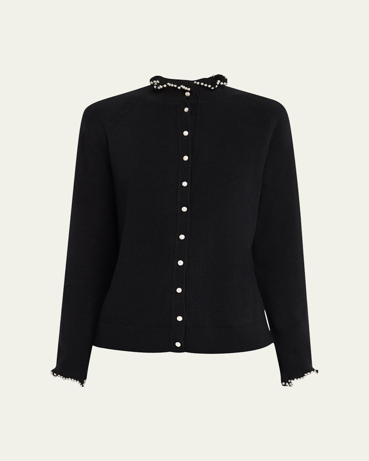 Lafayette 148 New York cardigan with handembroidered faux pearl trim and naturallyhued, freshwater natural pearl buttons Approx. 24"L from shoulders to hem Mock neckline Long raglan sleeves Relaxed fit Cashmere Unlined Hand wash or dry clean Imported