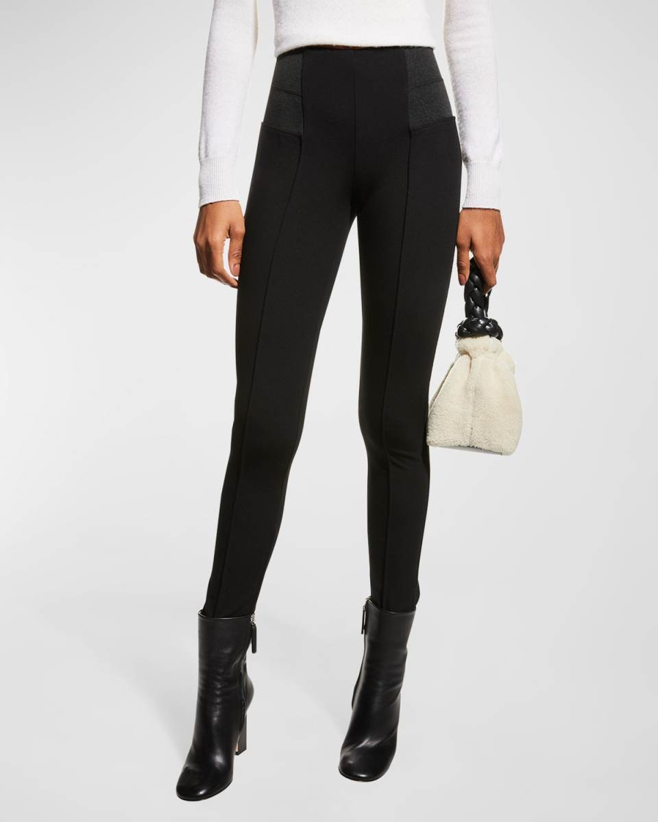 Lafayette 148 New York knit pants with raised center pintuck detail. Regular rise; wide elasticized side panels at waist. Approx. 30" inseam. Formfitting legs. Pullon style. Viscose/nylon/spandex. Dry clean. Imported of Italian material.