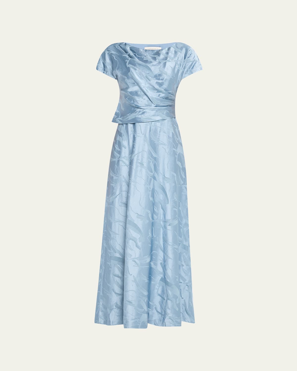 Lafayette 148 New York gown in Italian jacquard with pleated bodice Approx. 56.5"L from shoulders to hem Scoop neckline Short dolman sleeves Full length Aline silhouette Invisible side zipper Viscose/linen/cotton Lining: Polyester/spandex Dry clean Imported