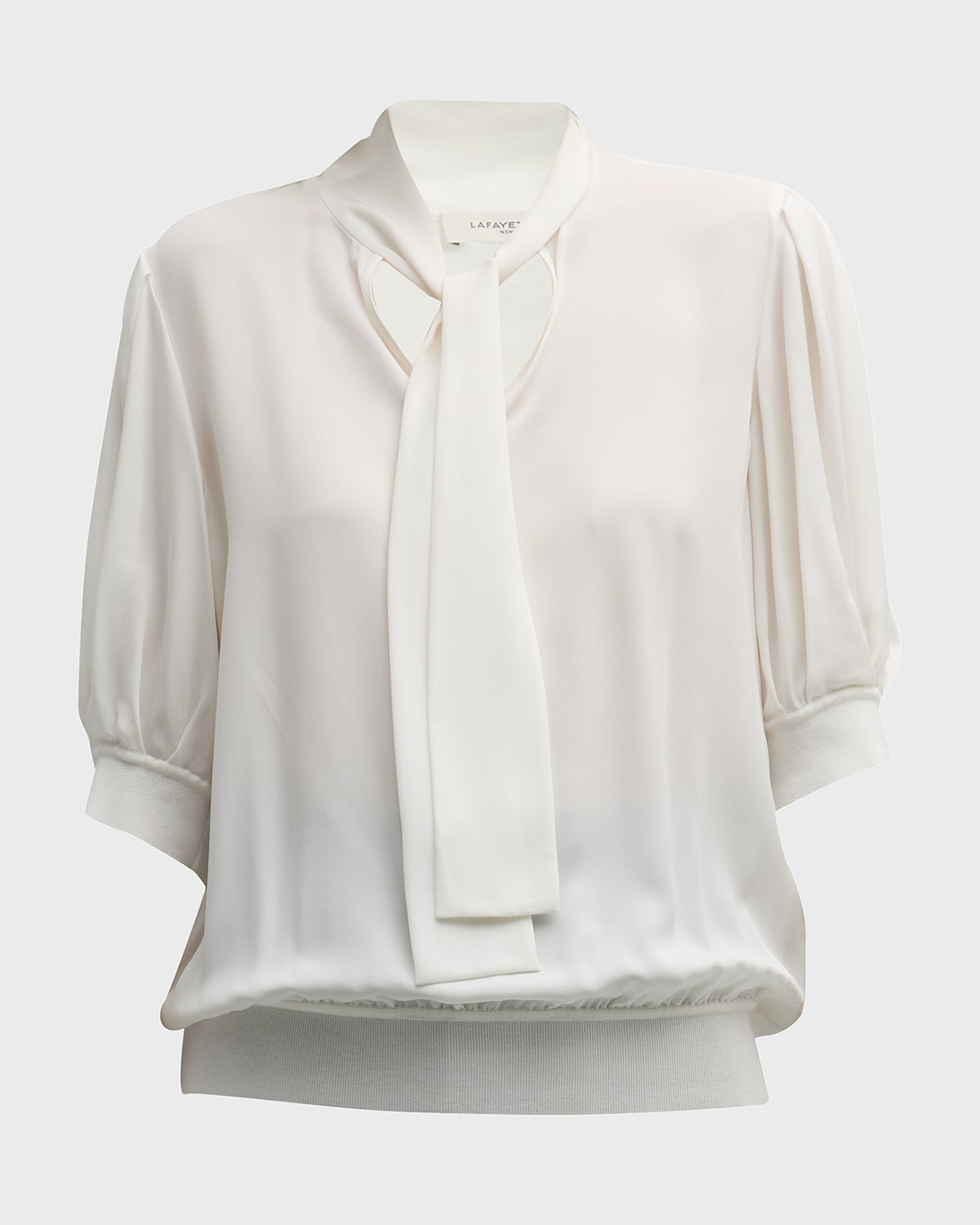 Pleated Elbow-Sleeve Tie-Neck Blouse