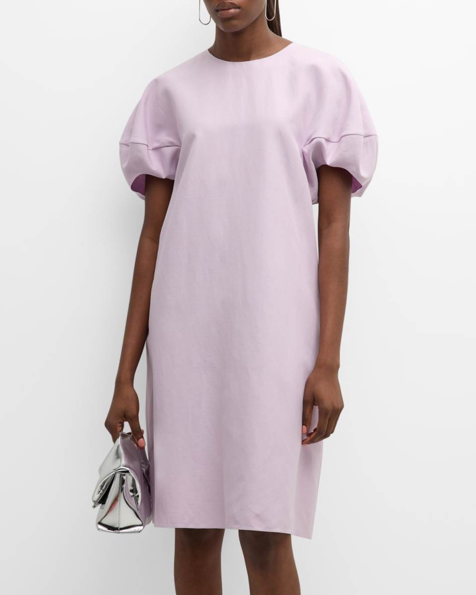 Lafayette 148 New York midi dress with seaming detail at the sleeves Approx. 37"L from shoulders to hem Jewel neckline Short puff sleeves Side seam pockets Hem falls around the knee Shift silhouette Invisible back zipper Silk/linen Dry clean Imported