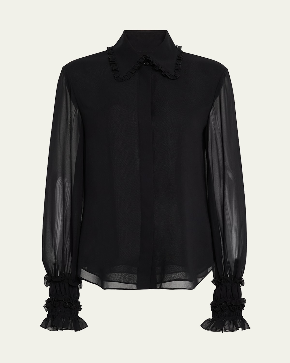 Lafayette 148 New York blouse with ruffle trim Approx. 25"L from shoulders to hem Spread collar; concealed button front Long blouson sleeves Elasticized cuffs Shirttail hem Relaxed fit Silk Lining: Polyester Dry clean Imported