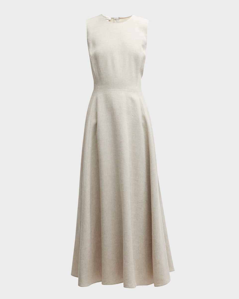 Lafayette 148 New York midi dress in a textured linenblend Approx. 48"L from shoulders to hem Jewel neckline Sleeveless Princess seams Hem falls at midcalf Aline silhouette Invisible back zipper Viscose/linen Unlined Dry clean Imported