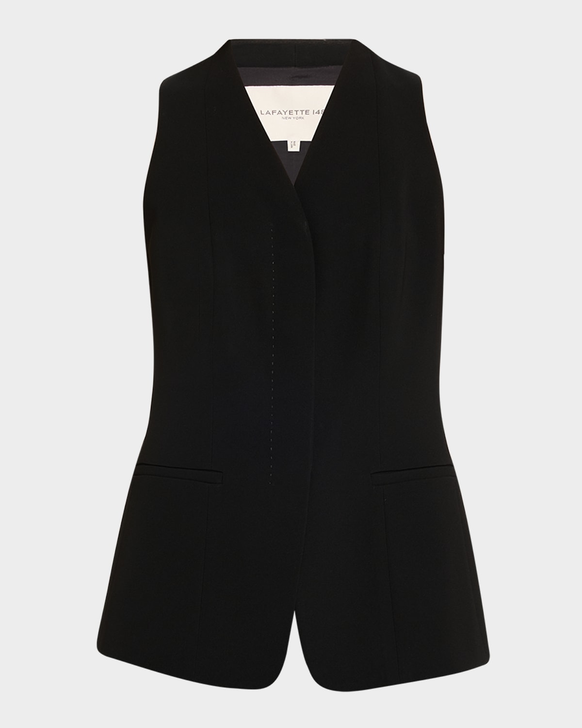 Lafayette 148 New York vest crafted in finesse crepe with pick stitch detailing Approx. 23.5"L from shoulders to hem V neckline; concealed button front Sleeveless Princess seams Tailored fit Acetate/polyester/elastane Imported