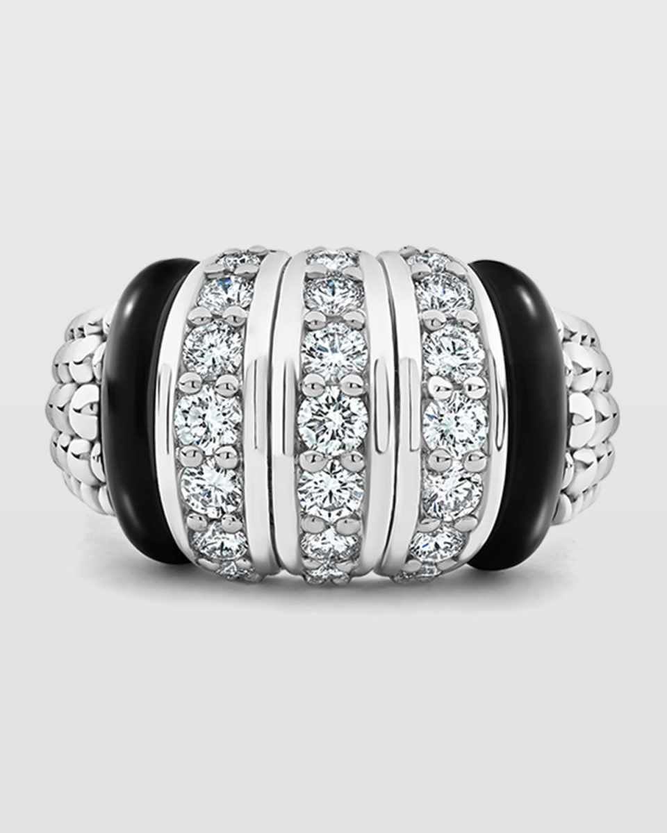 Black Caviar ring from LAGOS. Sterling silver and black ceramic. Three link stations with diamonds. 1.11 total diamond carat weight. Imported.